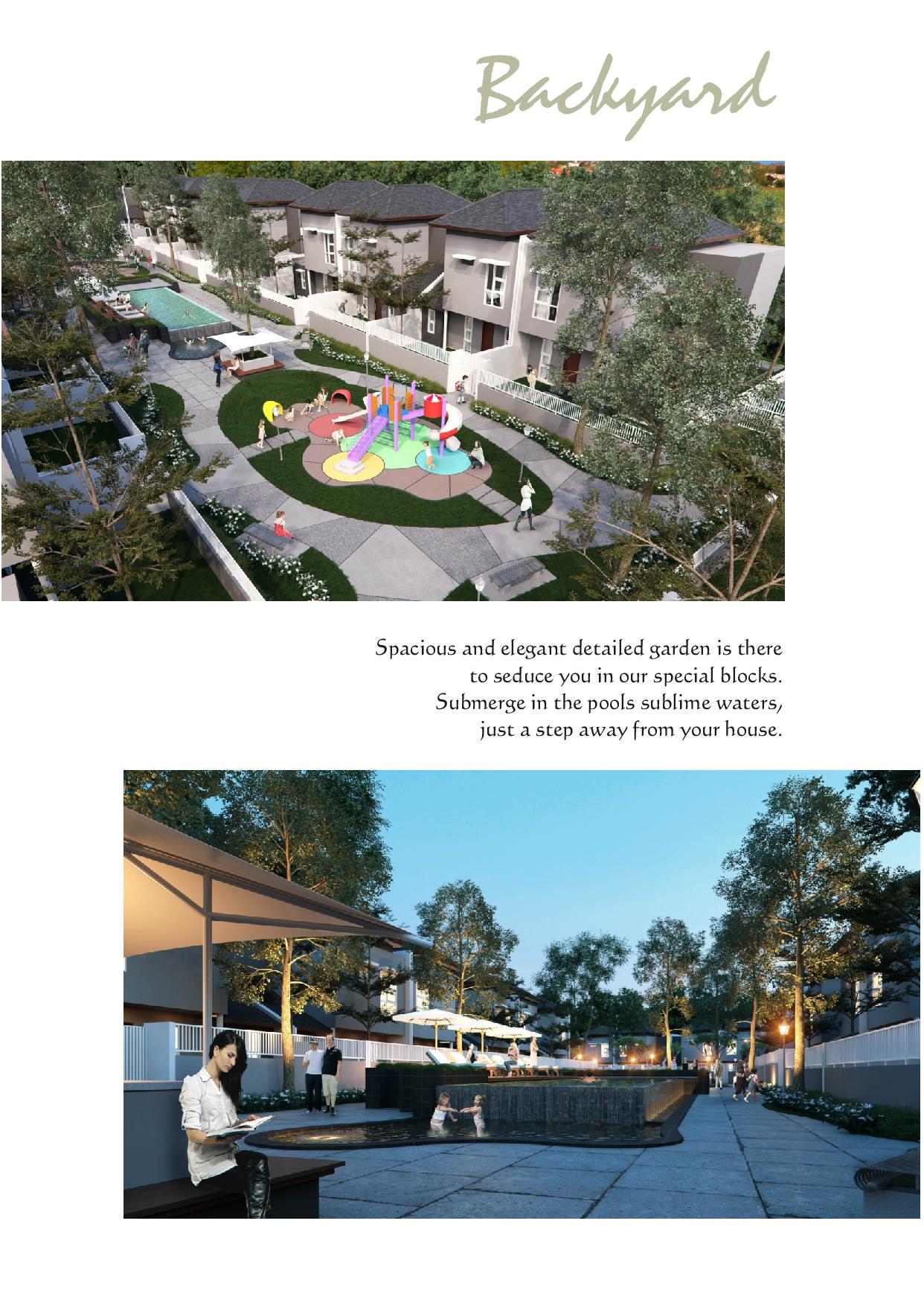 Backyard tersebut terdiri dari taman hijau, kolam renang serta tempat bermain anak.